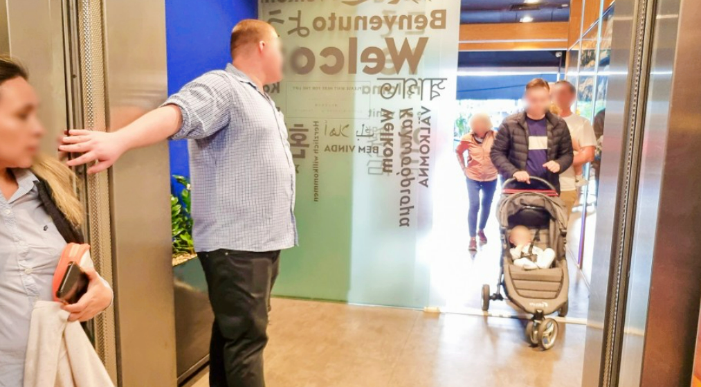엘리베이터 앞에 기다리다 순서가 되면 탑승 합니다.